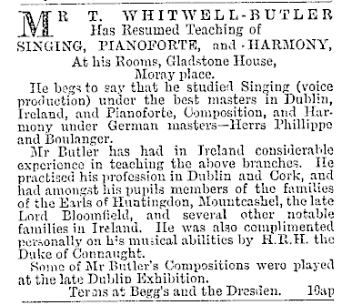 Whitwell-Butler soon became involved with the local community, was a member of the St Joseph’s cathedral choir and held in the formation of the Dunedin Leiderkranz. His original song “Fate’s decree” was performed by the visiting Royal Italian Opera Company soprano Felicina Cuttica. His credentials increased to include mention of his supposed training and high society individuals he had taught: