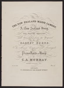 New Zealand maid’s lament: a New Zealand song. London, 184-? The words to this song were written by the famous Pākehā-Māori Barnet Burns whose eventful life is described in Te Ara, and the music by a less famous music teacher and harpist from Hull named Charles Alexander Murray.