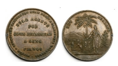 In the competitive area of music selling, many music sellers tried adventurous ways of promoting their business. A shortage of small currency in New Zealand from the 1860s to the 1880s led to some businesses striking their own tokens which became recognised as ordinary currency, not only with the issuing firm but with all other traders. Several Christchurch businesses had their own tokens, including music dealers, Milner & Thompson. Milner & Thompson’s ten tokens were struck for them by the Melbourne firm of Stokes and Martin and first circulated at the first Canterbury Society of the Arts Exhibition in 1881. Milner & Thompson were the last issuers of tokens in New Zealand.