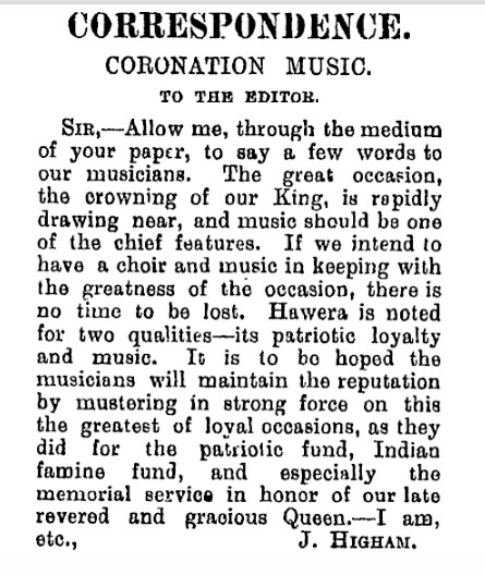 The recent coronation of King Charles III brings to mind the coronations which took place during the period of this website. Edward VII’s coronation ceremony took place on 9 August 1902 and George V’s on 22 June 1911. Both these events were celebrated through music in New Zealand.