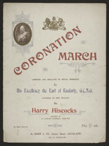 Harry Hiscock’s Coronation March was published in 1902 and contemporary reviews described it as “of truly dignified character, wholly in keeping with the subject,” and a copy was presented to the King. Tyrell Baxter’s Coronation waltz was written on the occasion of the coronation of King George V in 1911. Geraldine-based Baxter employed a somewhat unusual way of distributing his work. Advertisements in the Otago Daily Times and the Evening Post sought canvassers to sell copies at a 50% commission rate. Ernest Empson of Christchurch set the words of Johannes C. Andersen’s Song of Empire: Coronation song and Harry Hiscocks also made a contribution to George V’s coronation with his song Hail celebration morn.