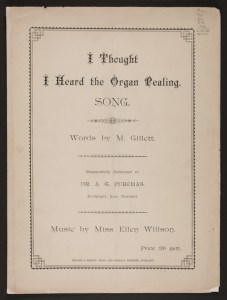 Wilson’s earliest known composition was the March of Triumph published in 1856 but most of her compositions dated from the mid 1870s. She wrote piano works in the popular forms of waltzes, gavottes, mazurkas and marches, songs, choral works and some unpublished instrumental ensembles. Many of her New Zealand works were performed at concerts in Dunedin and in 1895 a concert was presented made up entirely of her works. In addition to her musical compositions she wrote a small (32 pages) book on musical ‘grammar’, drawing on her considerable experience as a piano teacher. In 1892 she also wrote a paper for the Otago Institute entitled Analogy between light and sound : are they convertible? which indicates she may have experienced musical synaesthesia. Wilson travelled back to England on several occasions while living in New Zealand. In 1897 she sold her grand piano (but not her property), indicating that she was planning a longer visit. Her connection with New Zealand remained strong and her song March On made specific reference to New Zealand soldiers in the Boer War.